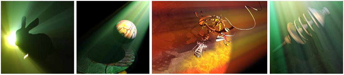 | Scattering effects arising from participating media, such as smoke, haze and fog, dramatically add to perceived realism in rendering. As shadows affect illumination throughout an environment, they significantly diminish scattering effects in umbral regions. Unlike surface shadowing, accurate volumetric shadows require simultaneously integrating illumination, scattering and attenuation throughout the volume, which proves challenging for interactive applications. We propose a method for rendering volumetric shadows in homogenous single scattering media that combines shadow volume and ray marching techniques, which eliminates performance deficiencies inherent in both. We extend this approach to interactively render shadows from textured lights and show results under two scattering models.
